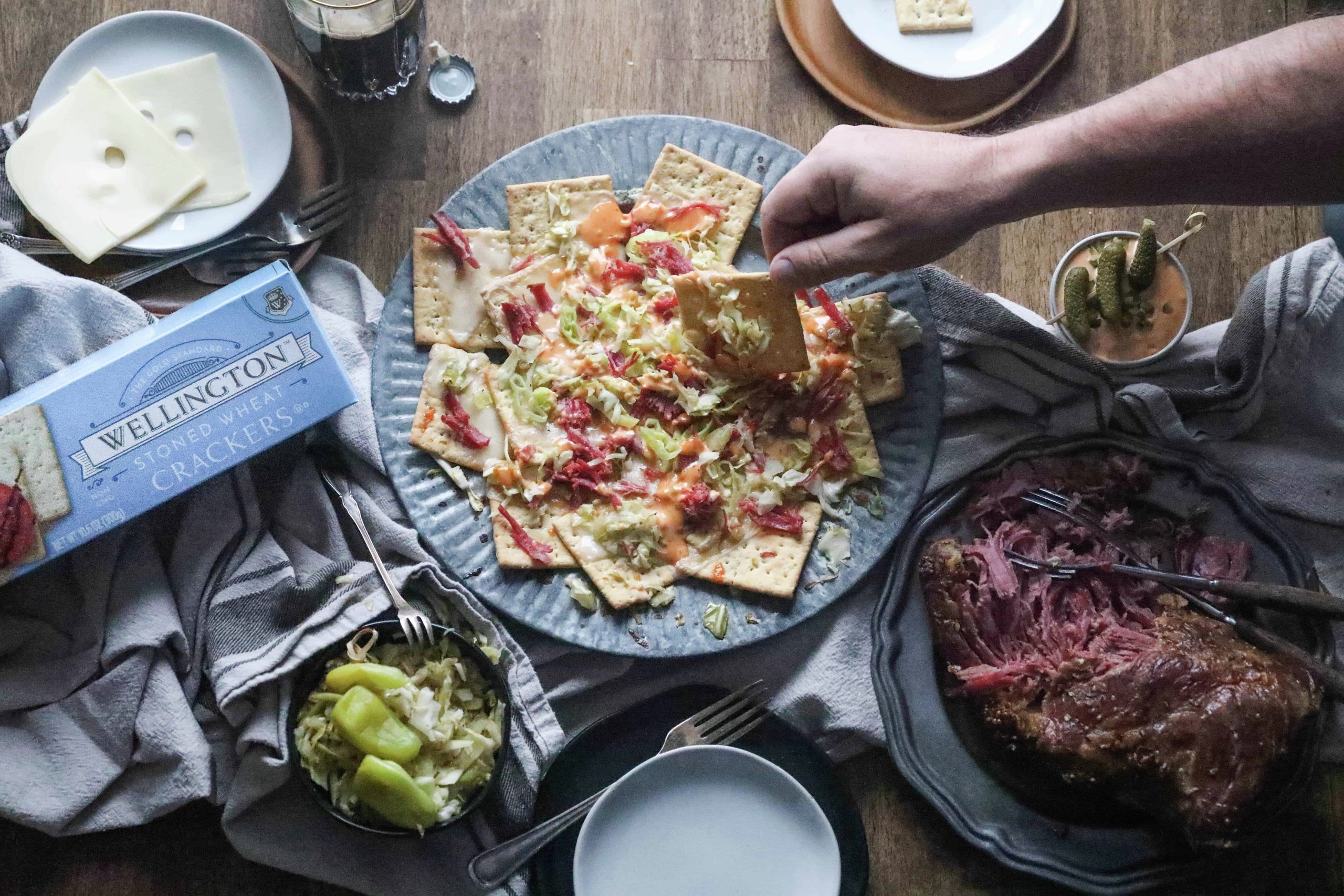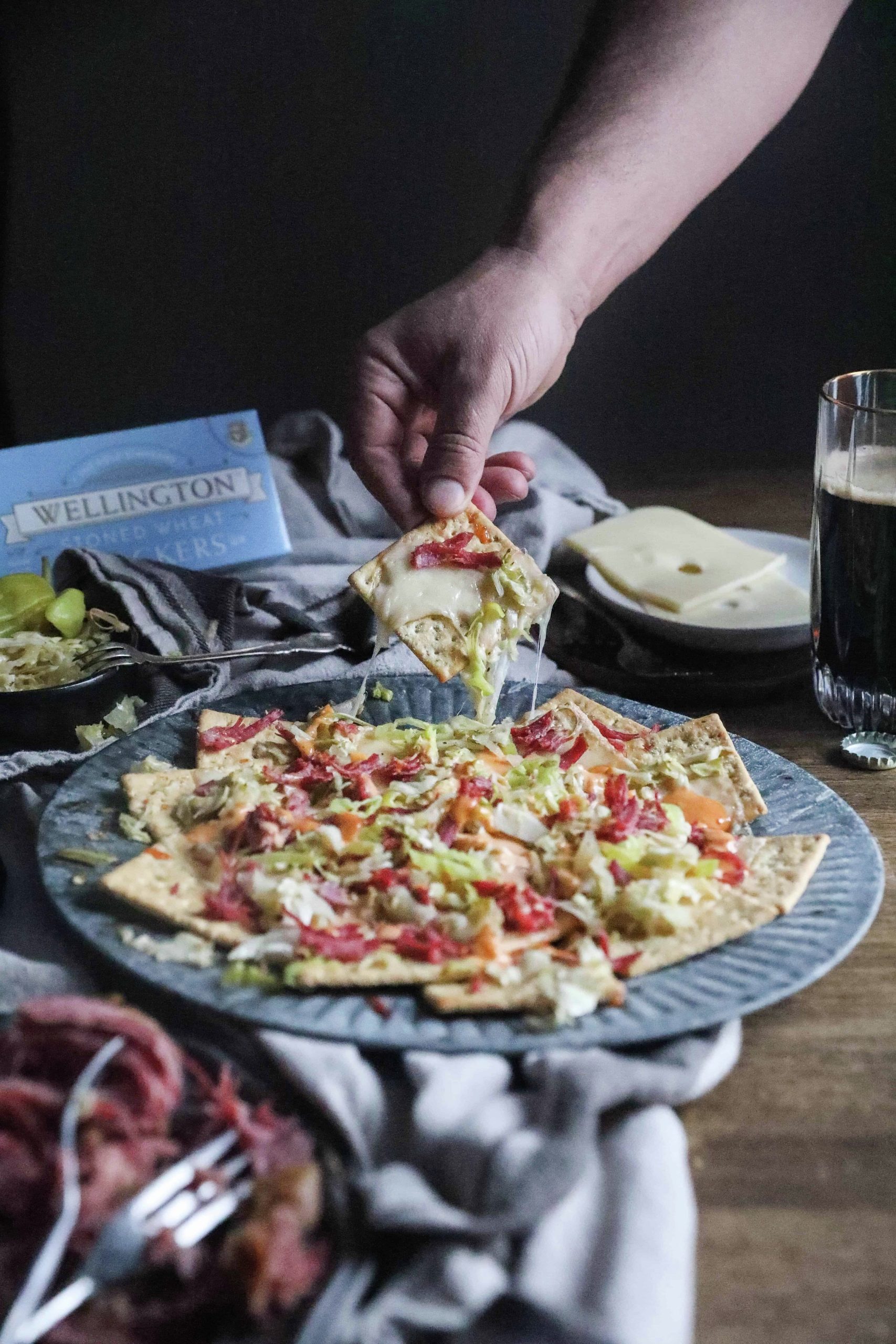 2. Lay the crackers out on a sheet or oven safe pan. Top with cheese, corned beef and sauerkraut. Place in the oven at 350 degrees for 5 minutes, or until the cheese is melted.
